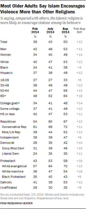 Pew's September survey found that 70 percent of white evangelical Protestants now believe “Islam encourages violence more than other religions.” While this number, one of the highest of any demographic group, has risen 13 percentage points since February, the beliefs of Christians from all backgrounds have shifted against Islam.