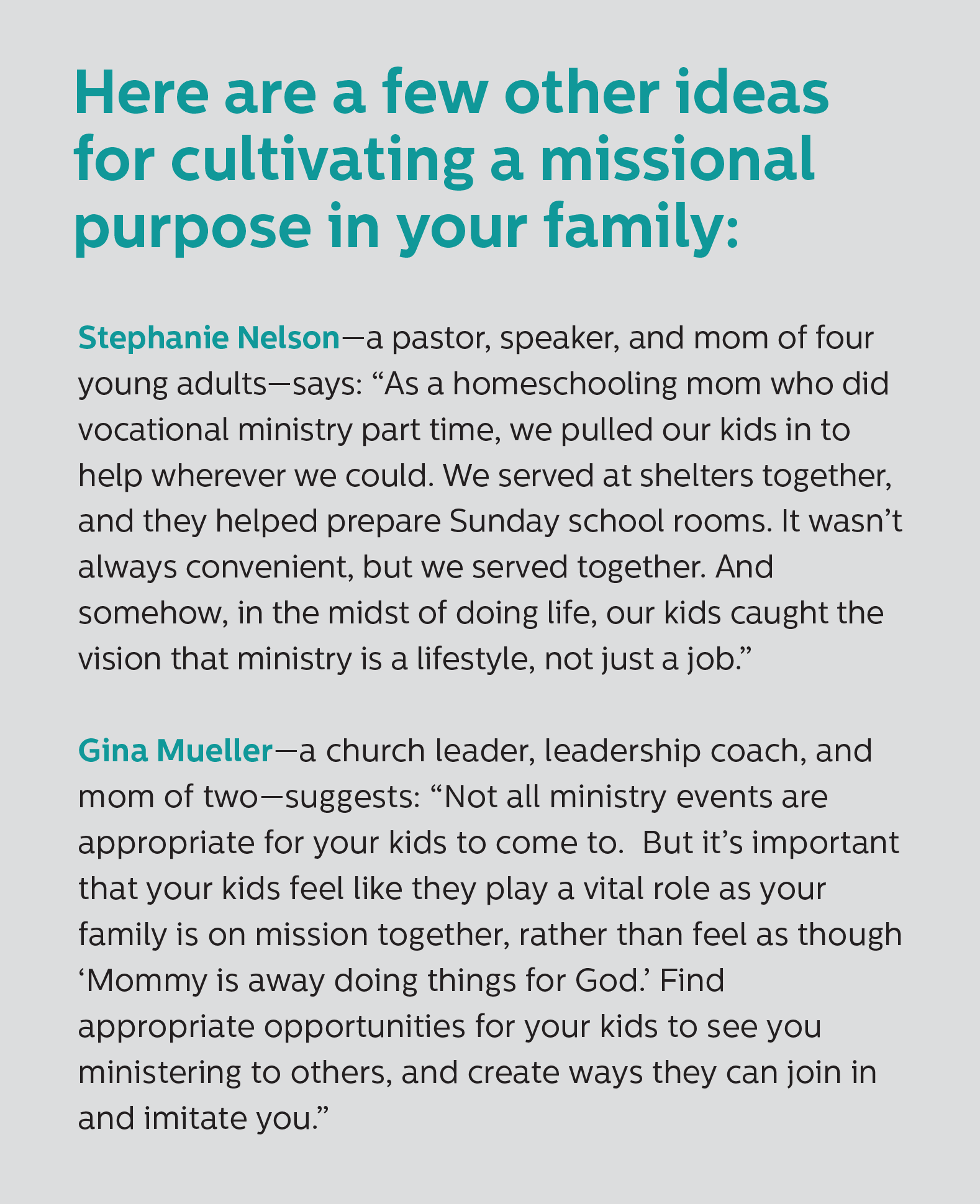 My husband and I responded to God’s call because he brings good news and he’s on the move in our world! We want our kids to experience God’s work in and through their own lives. As a result, they’ve joined in local service projects and accompanied us on missionary adventures. We have a special family meal and communion at the start of each school year where we pray for their friends and commission each other into the year ahead. As parents, we look for ways to get involved in their school so we can participate in God’s mission there.