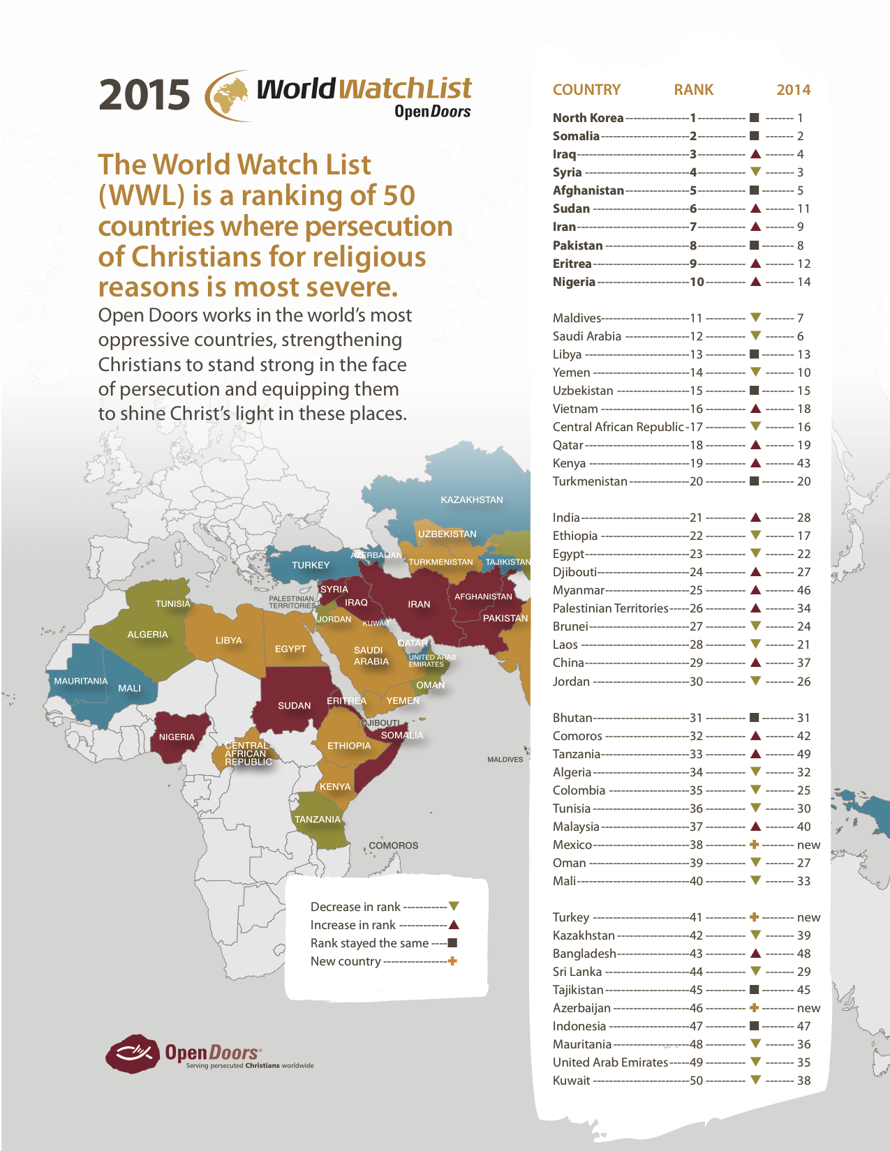 WWM offers a detailed report on the 2015 World Watch List, as well as a trend analysis, the complete scores of each country, further details on the top 20 countries and the remaining 30, and an examination of religious violence.