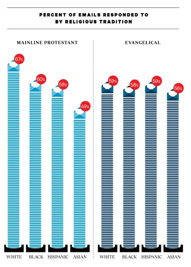 We also didn’t expect that Asian-sounding names would receive the fewest replies. Perhaps the mainline Protestant churches assumed that Wen Lang Li and Jong Soo Kim did not speak English as their first language. Given the centrality of language in religious practice, this would be another obstacle to them integrating into a congregation.