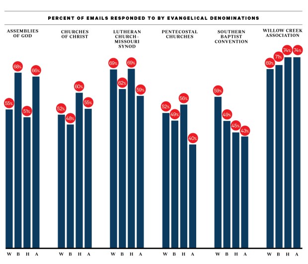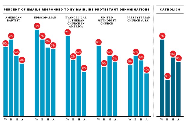 Evangelical and Catholic churches varied little across the letters. For every 100 evangelical churches that responded to white-sounding names, 97 replied to black names, 100 to Hispanic, and 94 to Asian. These differences were not statistically significant. Likewise with the Catholic parishes. (Though, since we included relatively fewer parishes, our tests of them were statistically weaker than for evangelical and mainline churches.)