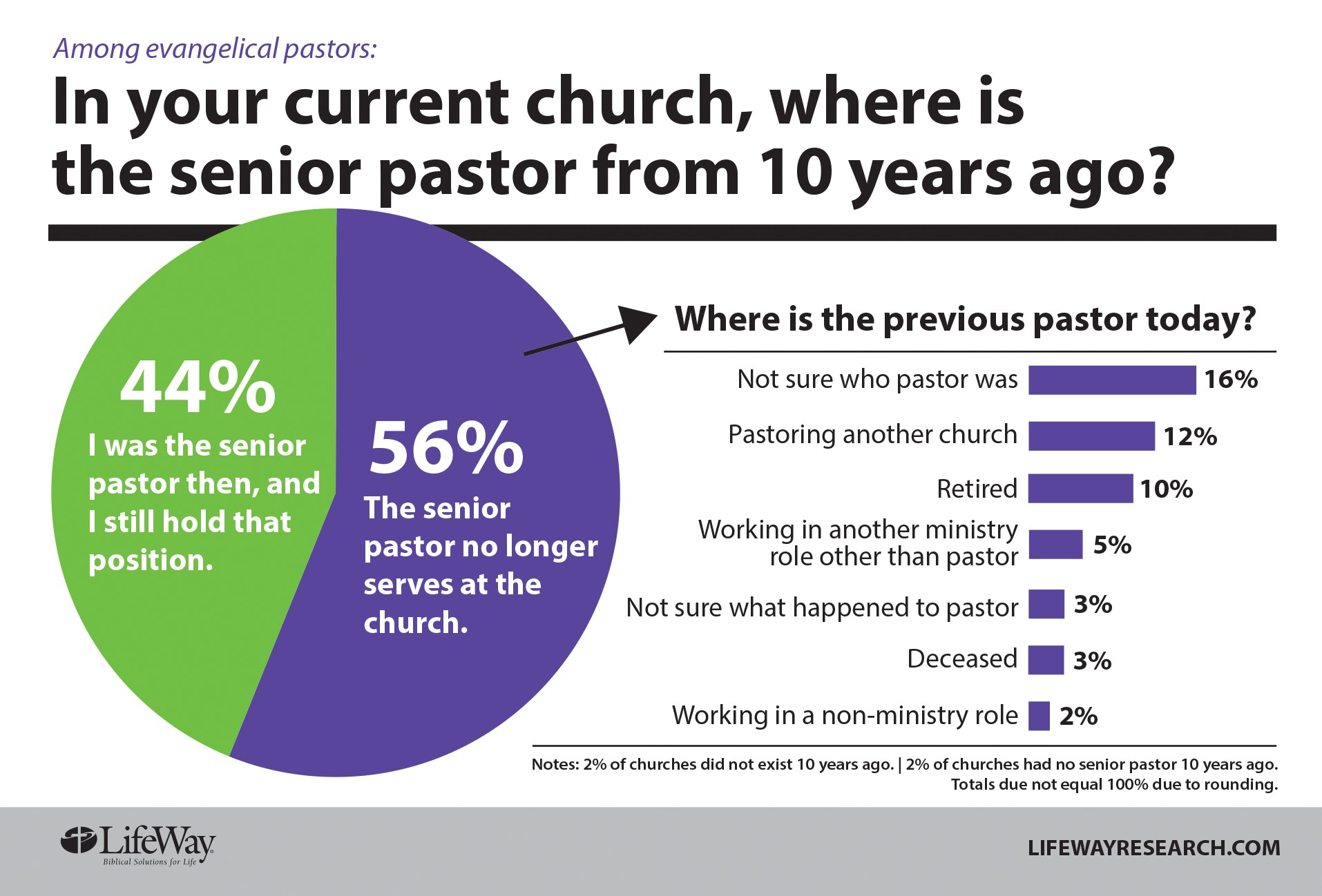 In a first-of-its-kind study, LifeWay Research surveyed 1,500 pastors of evangelical and historically black churches and found an estimated 13 percent of senior pastors in 2005 had left the pastorate 10 years later for reasons other than death or retirement.
