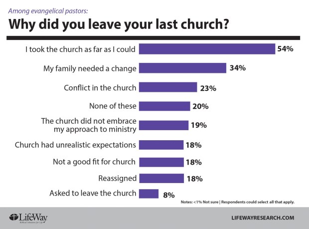 Most said they moved on because they had taken the previous church as far as they could (54%). However, 23 percent of pastors who changed churches say they left because of conflict in the church.
