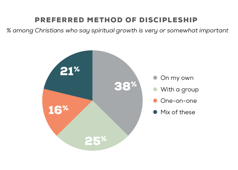 The lower numbers for parishioner involvement in activities match up with the way Christians prefer to manage their discipleship. A quarter of those who say spiritual growth is important would rather be with a group, 16 percent prefer to meet one-on-one, and 21 percent would rather do a mix of individual and group options. But a plurality (37%) prefer to pursue discipleship on their own.