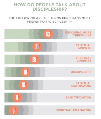 - When asked to describe “the process of growing spiritually,” both practicing and non-practicing Christians prefer the terms “become more Christ-like” (43%), “spiritual growth” (31%), and “spiritual journey” (28%) to “discipleship” (18%) and “spiritual maturation” (16%). The least popular phrases were “sanctification” (9%) and “spiritual formation” (5%).