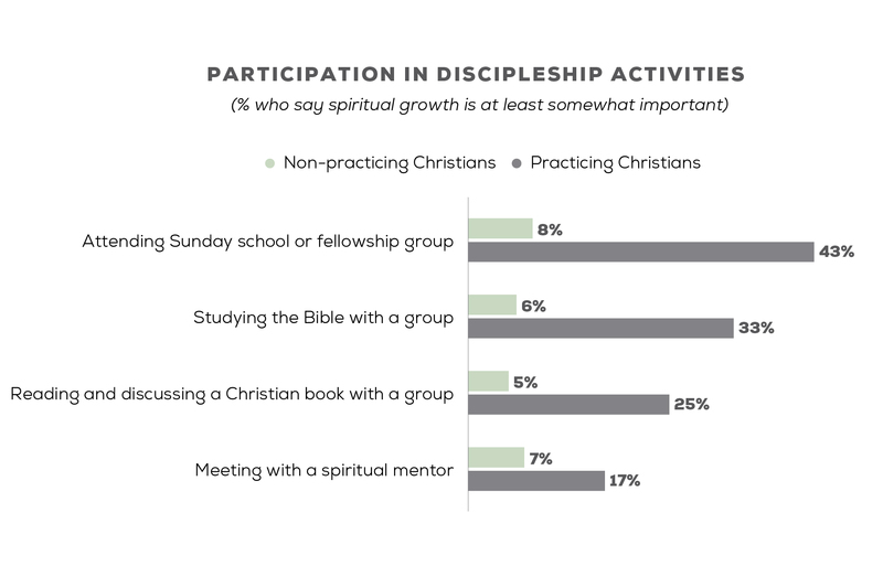“Despite believing their church emphasizes spiritual growth, engagement with the practices associated with discipleship leave much to be desired,” the report stated. Fewer than half of practicing Christian adults are involved in activities such as Sunday school or fellowship groups (43%), a group Bible study (33%), or meeting with a spiritual mentor (17%).