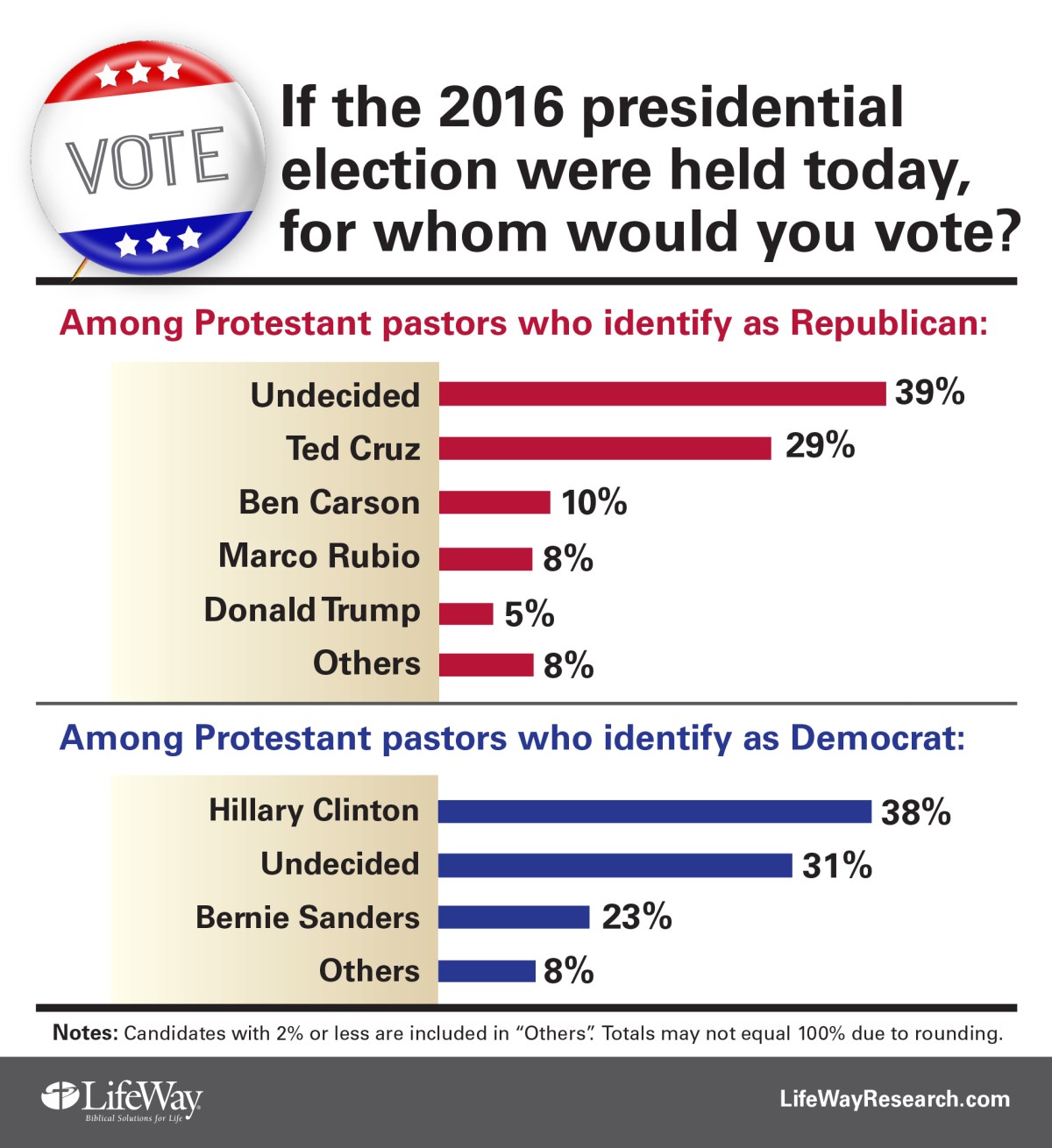 - Among pastors who are Republicans, Cruz (29%) is in the lead, followed by Ben Carson (10%), Marco Rubio (8%), and Trump (5%). Meanwhile, 39 percent are undecided.
