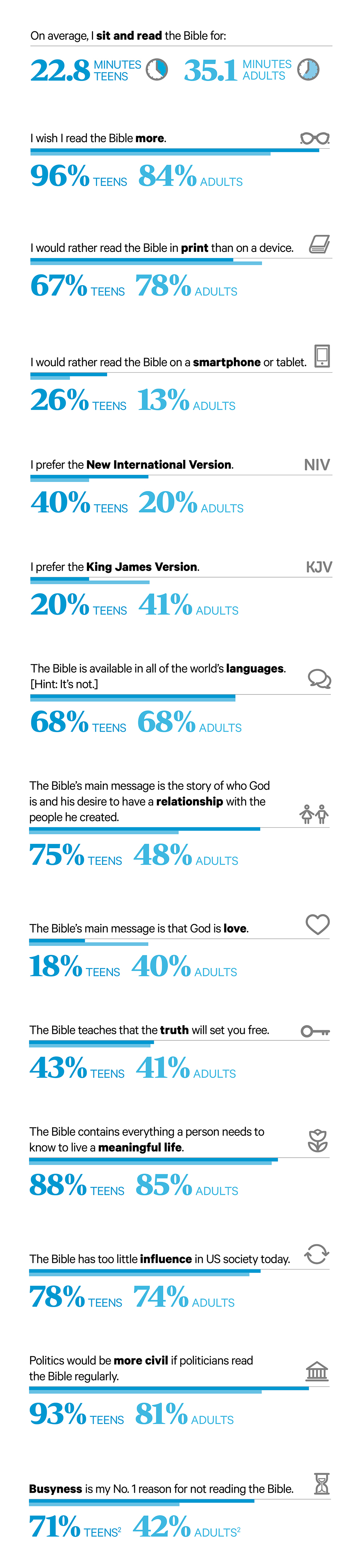 1 Defined as Americans ages 13 to 17 (teens) or ages 18 and older (adults) who self-identify as Protestant, attend a religious service at least once a month, and say their faith is very important in their lives. 2 All Bible-reading teens and adults.