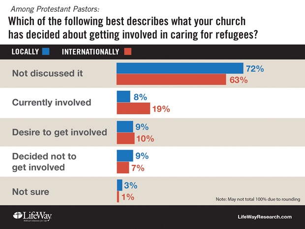 Protestant churches in the US are twice as likely to fear refugees as to help them, according to a LifeWay Research survey taken after ISIS attacked Paris. In a pre-Paris poll sponsored by World Vision, about three-quarters of self-identified "committed Christians" (76%) said they were willing to take future action to help Syrian refugees. However, only 37 percent of Americans overall and 44 percent of committed Christians said they had helped Syrian refugees already.