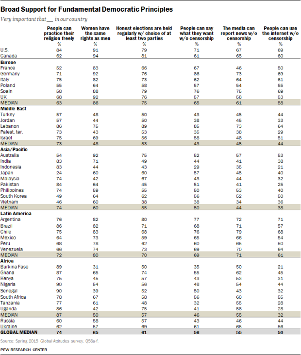 Canada’s concern for religious freedom ranked in the bottom third of the countries Pew surveyed. Religion was the most valued democratic principle, Pew found, garnering the support of 74 percent of people globally.