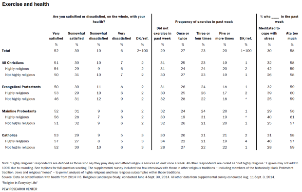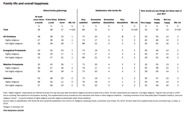 Beyond that, the everyday lives of the highly religious look a lot alike. More than 80 percent are very happy or pretty happy with their lives overall; more than 90 percent are satisfied with their family life.