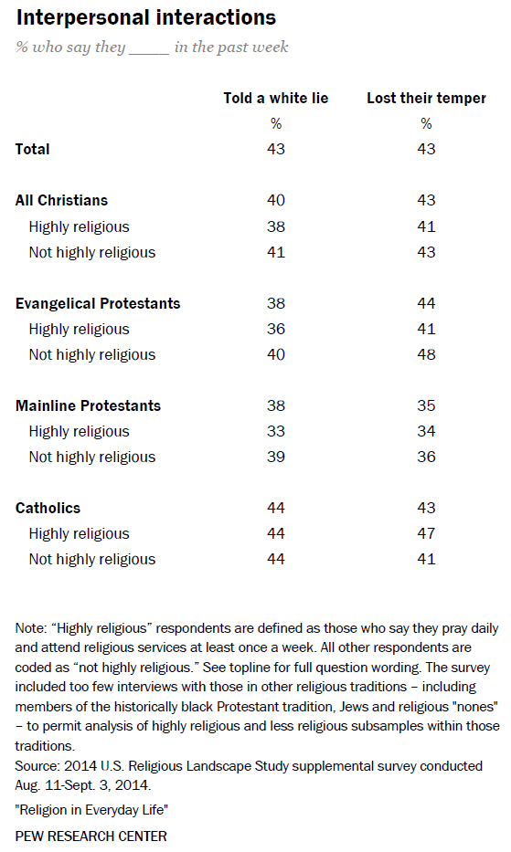 Perhaps as a result of the practice of confession, highly religious Catholics were more likely to admit to telling a white lie in the past week (44%, compared to 36% of evangelicals and 33% of mainline Protestants), as well as to admit they had lost their temper (47%, compared to 41% of evangelicals and 34% of mainline Protestants).