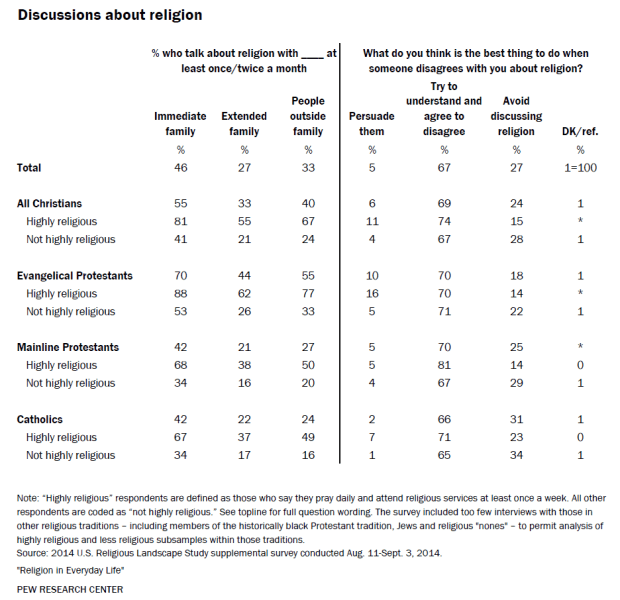 Evangelicals are also much more likely to talk about religion with their immediate and extended family.