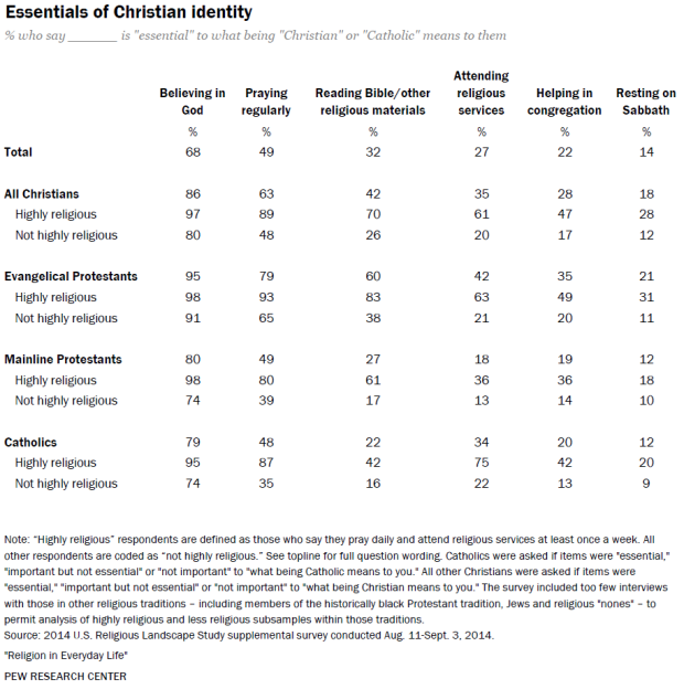 Four in five people who are not highly religious said believing in God was essential to faith. But less than half said praying was essential, while a quarter or less said reading the Bible, attending religious services, helping in the congregation, or resting on the Sabbath were essential to being a Christian.