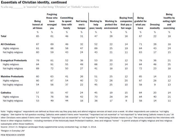 Highly religious evangelicals are also more likely to say honesty, forgiveness, controlling one’s temper, dressing modestly, and physical health are essential to Christianity.