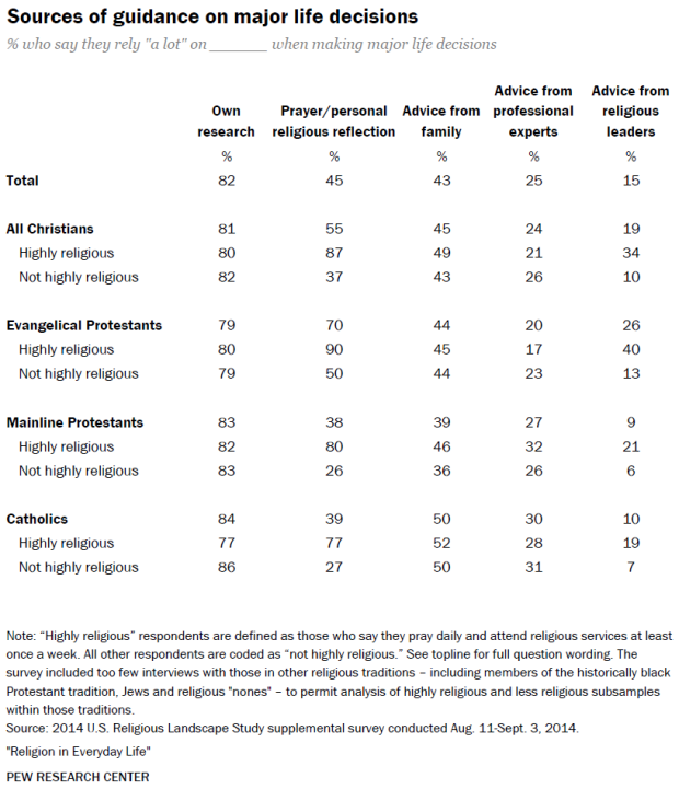 When weighing major life decisions, 7 out of 10 evangelicals and 9 out of 10 highly religious evangelicals said they prayed. In comparison, 4 out of 10 mainline Protestants and Catholics, and 8 out of 10 highly religious mainline Protestants and Catholics, did the same.