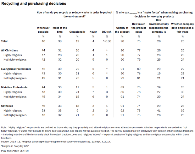Both Catholics (92%) and evangelicals (90%) are more likely to make everyday purchases based on the quality of the product than mainline Protestants (85%), while evangelicals and mainline Protestants (78%) are more likely than Catholics (73%) to consider how much the product costs.Highly religious Catholics are also more likely to recycle: 86 percent do at least most of the time, compared to 73 percent of evangelicals and mainline Protestants.