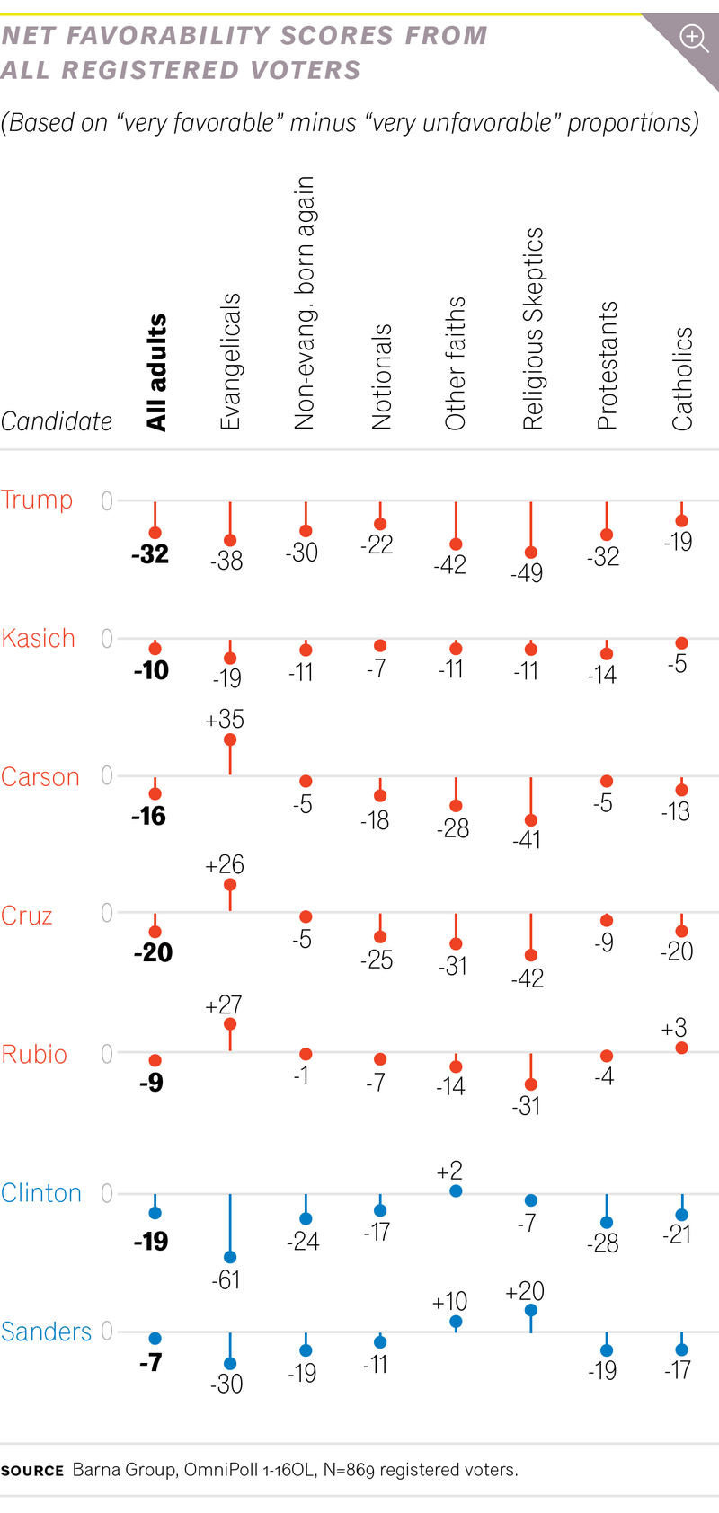 Among evangelicals, Trump has a net favorability rating of -38 percent, according to a recent survey by Barna Group. Clinton’s is -61 percent.