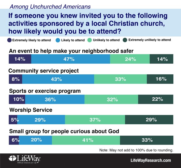 “Concerns for neighborhood safety and desire to express compassion to the under-resourced seem to be the biggest potential draws for the unchurched to get connected to a church,” noted Rick Richardson, professor of evangelism and leadership at Wheaton College and research fellow for the Billy Graham Center for Evangelism. “Invite unchurched people to those kinds of events, and many say they will attend.”