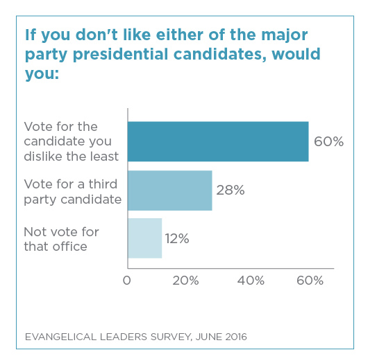 When faced with two disagreeable candidates, 60 percent of the National Association of Evangelicals (NAE) board members polled last month said that Christians should vote for the candidate they dislike the least, while 28 percent said to vote for a third-party candidate and 12 percent said to not vote for that particular office.