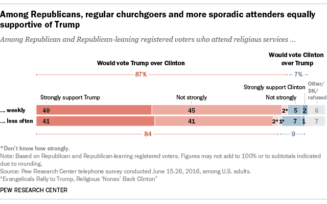 But today, regular churchgoers are just as supportive of Trump as those who rarely attend church: