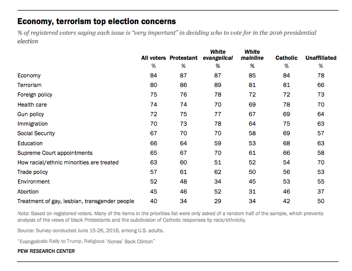 The top three issues the World panel said they were considering when selecting a candidate were abortion, religious freedom, and Supreme Court nominations. None overlap with the top considerations of white evangelical voters in the pews: terrorism, the economy, and foreign policy/immigration.