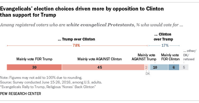 Overall, about a third (36%) of evangelicals are voting for a candidate they like, while more than half (55%) are voting against the candidate they like the least.