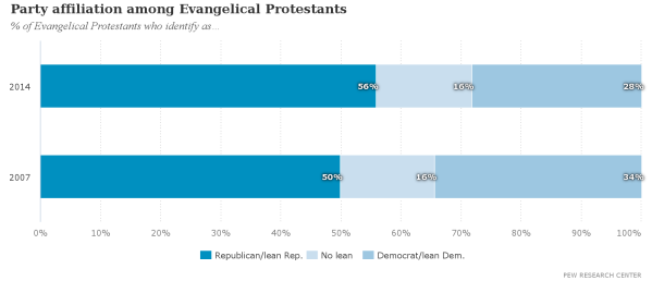 In 2014, 28 percent of evangelicals identified as Democrats. This was a decline from 34 percent in 2007: