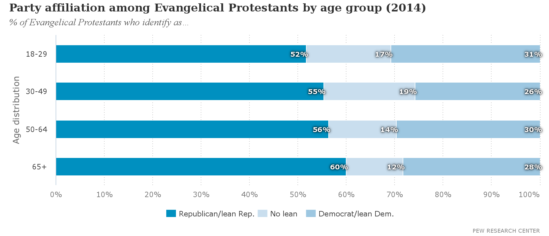 Overall, a similar share of evangelicals across age groups identify as Democrats (about 30%):
