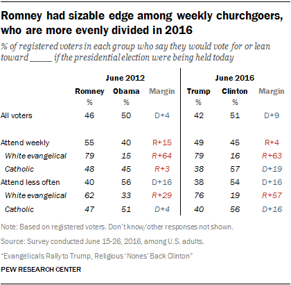 Trump only leads Clinton by four percentage points among regular churchgoers (49% vs. 45%), a “notable shift” according to the Pew Research Center. By comparison, Mitt Romney’s 15-point margin over Barack Obama in 2012 (55% vs. 40%) was much more indicative of the usual spread between Republican and Democrat candidates among weekly worshipers.