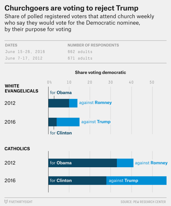 Meanwhile, white evangelicals voting Democrat this year are dramatically doing so in response to Trump’s candidacy. “The share of weekly churchgoing evangelicals who support the Democratic nominee has remained nearly flat from June 2012 to June 2016, but their reasons have changed,” writes FiveThirtyEight’s Leah Libresco. “Two-thirds of churchgoing evangelical Obama supporters described their vote as ‘for Obama’ rather than ‘against Romney,’ but the proportions are exactly flipped for Clinton.”