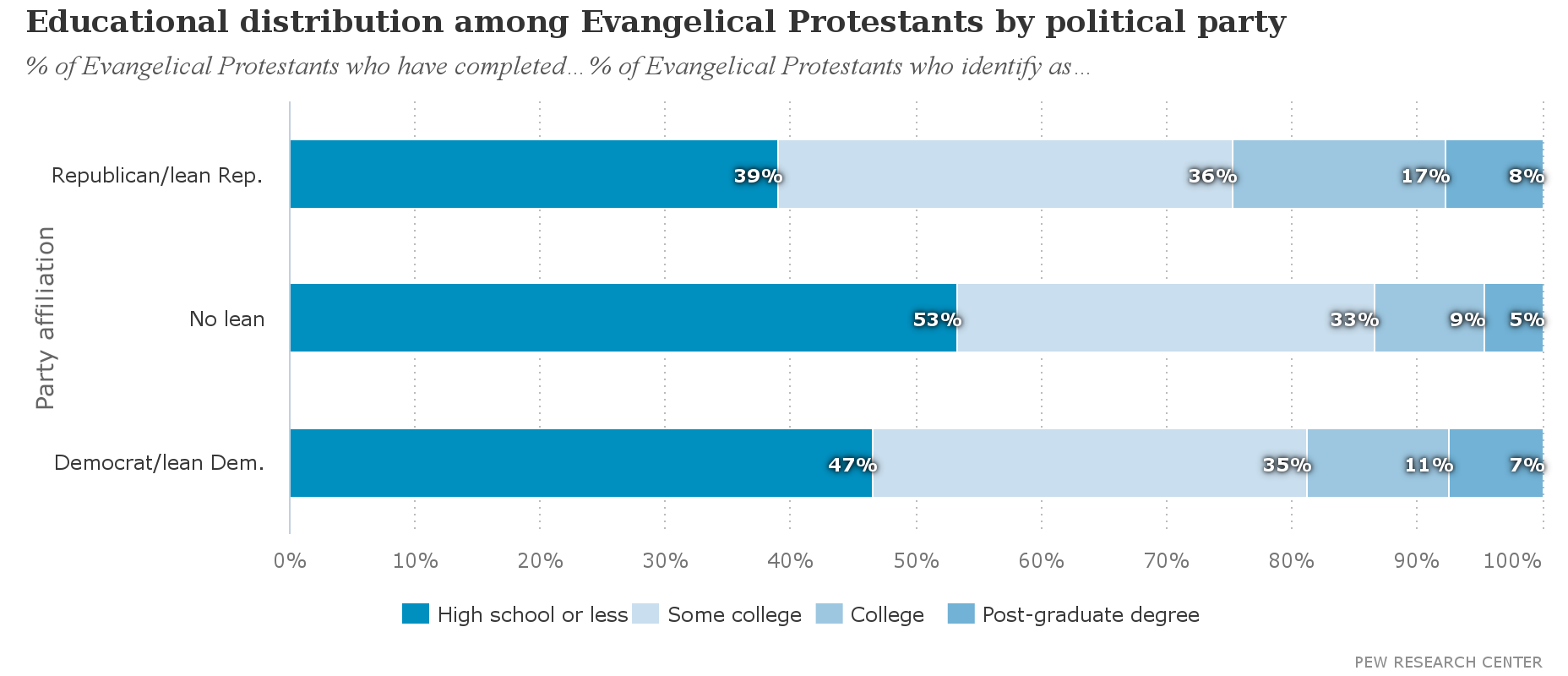 Evangelical Democrats are slightly less likely to have a college degree than evangelical Republicans (18% vs. 25%):