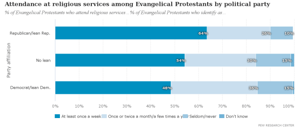 Evangelical Democrats are less likely to attend church weekly than evangelical Republicans: