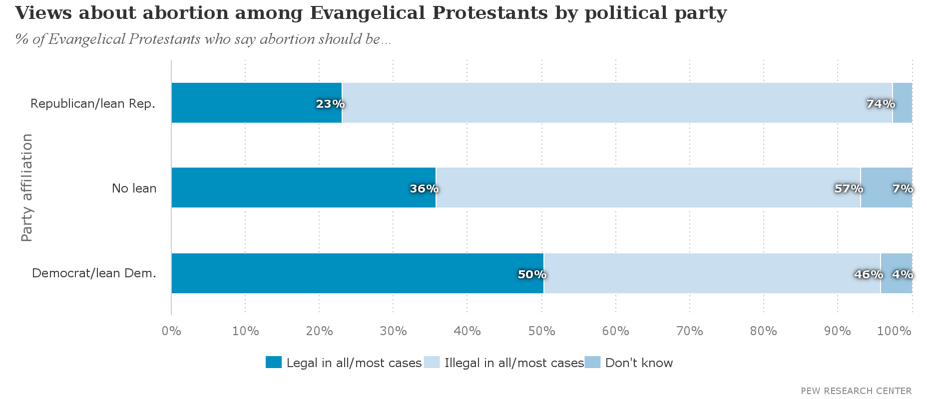 Almost half of evangelical Democrats believe abortion should be illegal in all or most cases (46%):