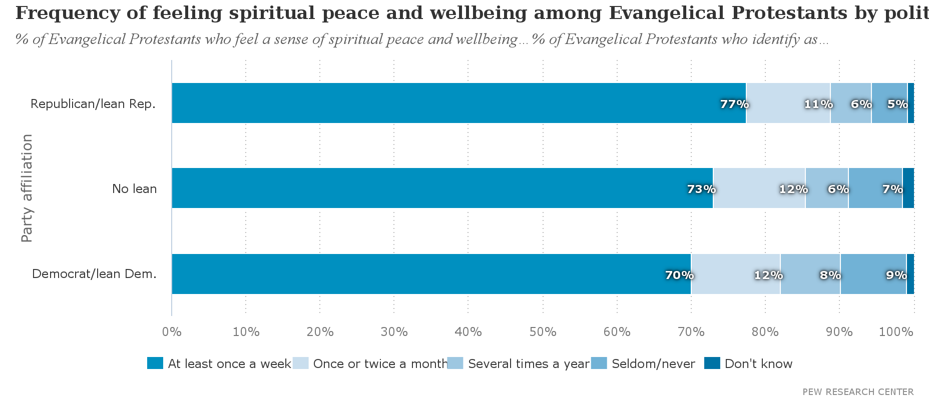 Evangelical Democrats are slightly less likely to feel “spiritual peace and wellbeing” weekly as evangelical Republicans (70% vs. 77%):