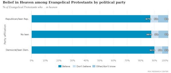 Evangelical Democrats are slightly more likely to believe in heaven than evangelical Republicans (though the difference falls within the margin of error):