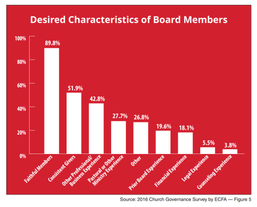That’s probably because the No. 1 qualification for a board member is faithfulness. Almost 90 percent of those surveyed said that was a characteristic they desired in church board members, far above the No. 2 qualification—being a consistent giver—which was desired by 52 percent of respondents.