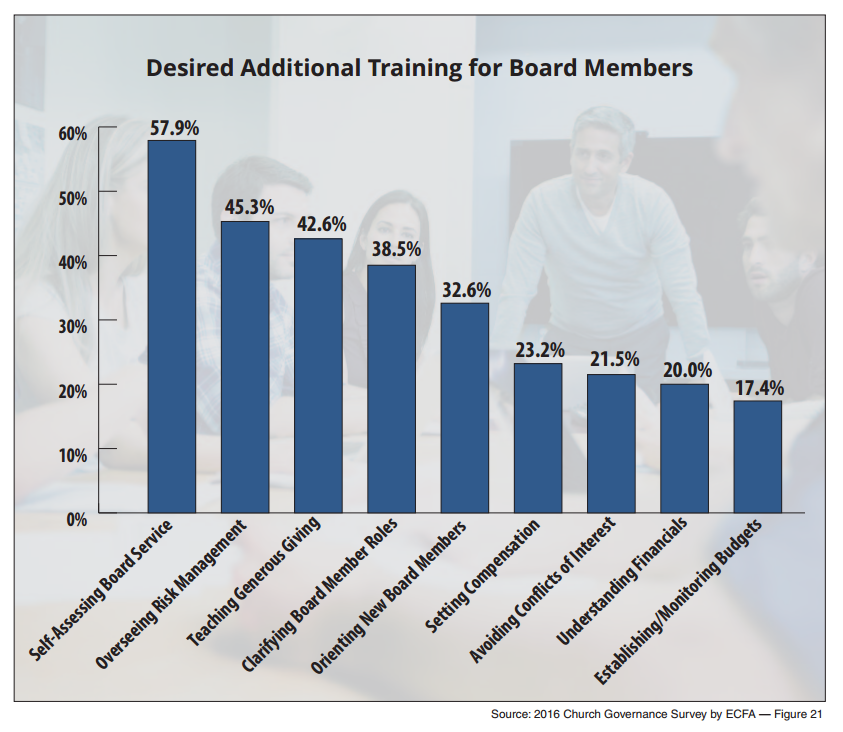 Most survey respondants said they’d like training on self-assessing their board service, overseeing risk management, and teaching generous giving. They were less interested in avoiding conflicts of interest (only 16 percent of churches have a policy and check conflicts annually), understanding financials, and establishing budgets.