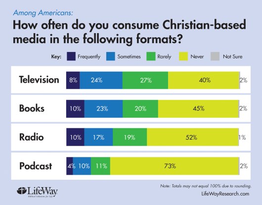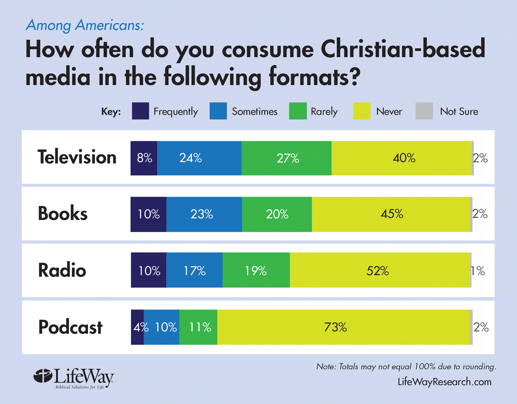 One quarter of Americans frequently (10%) or sometimes (17%) listen to Christian radio, according to a LifeWay Research survey of more than 2,000 Americans in 2014. Those who attend church once a week are more likely to listen frequently (27%), though not as many as self-identified evangelicals, who were more likely to listen both frequently (33%) and sometimes (34%).