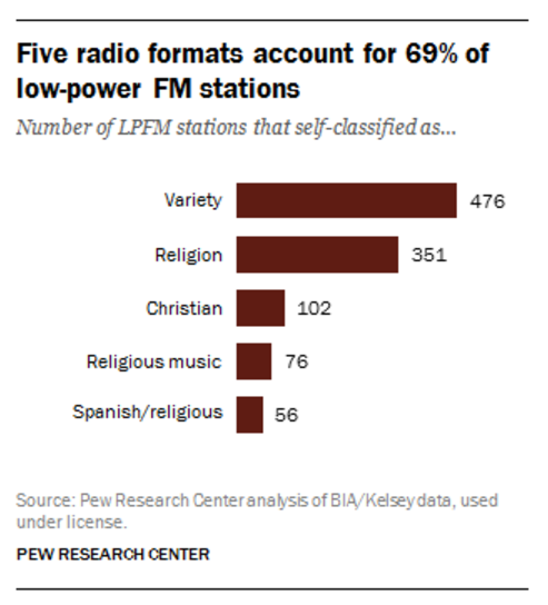 More than a third of low-power FM (LPFM) radio stations—whose non-commercial radio signals don’t reach farther than about 3.5 miles—are religious in nature, according to a poll from the Pew Research Center released today.