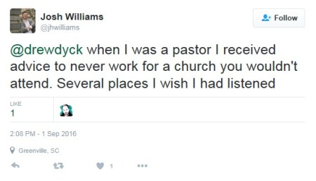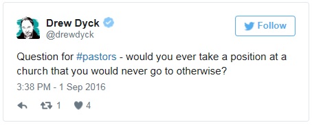 I realize there wasn’t enough information in my question to give a definitive answer (such is the nature of Twitter’s 140-character constraints). As many pointed out, the reason why a church is not a personal fit is an important factor. After all, if you wouldn’t attend a church because it teaches rank heresy, you probably won’t agree to lead it. On the other hand, if you were called to a church where, say, the music wasn’t exactly to your liking, you’d probably be willing to overlook that.