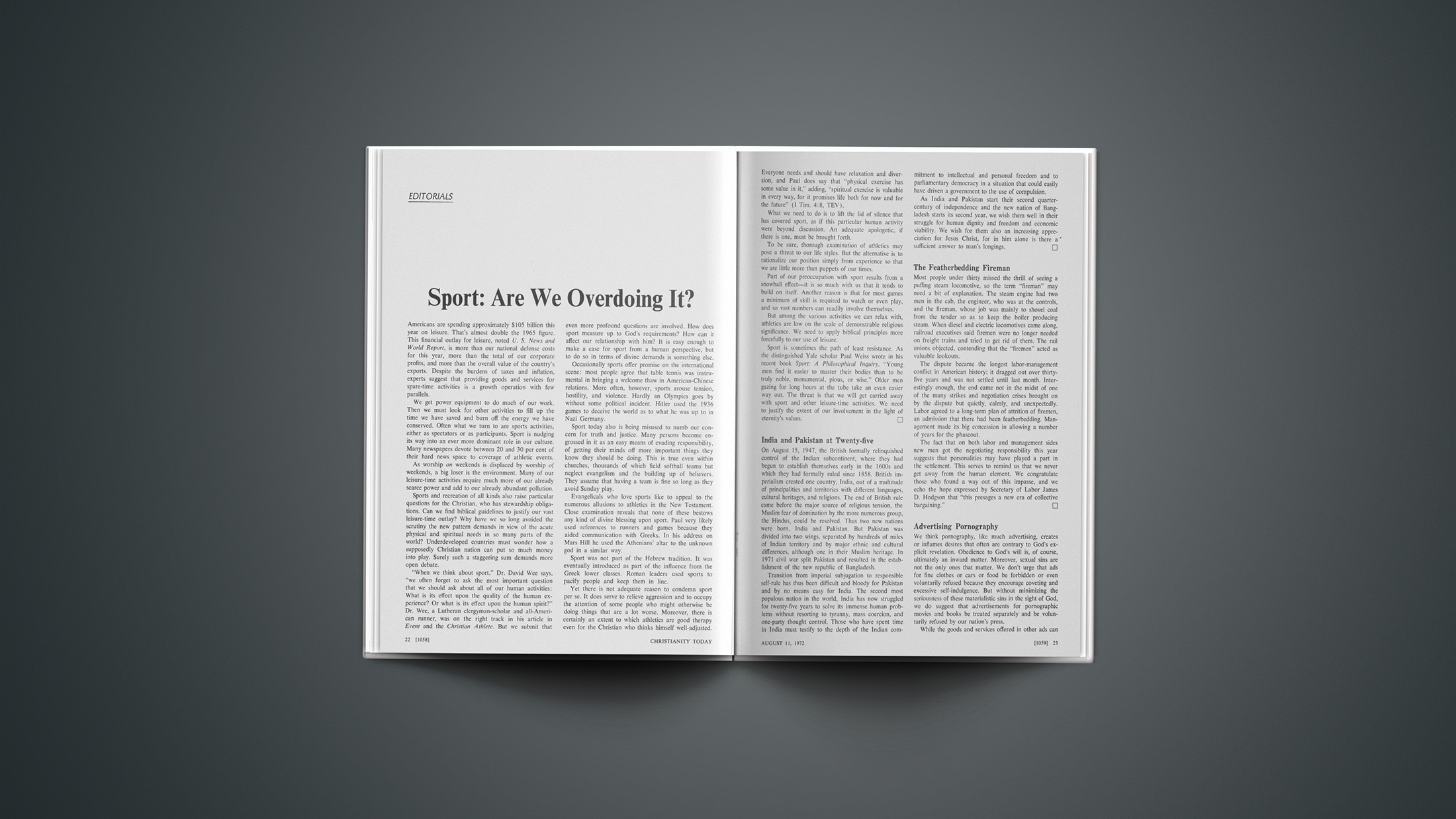 Americans are spending approximately 5 billion this year on leisure. That’s almost double the 1965 figure. This financial outlay for leisure, noted U. S. News and World Report, is more than our national defense costs for this year, more than the total of our corporate profits, and more than the overall value of the country’s exports. Despite the burdens of taxes and inflation, experts suggest that providing goods and services for spare-time activities is a growth operation with few parallels.We get power equipment to do much of our work. Then we must look for other activities to fill up the time we have saved and burn off the energy we have conserved. Often what we turn to are sports activities, either as spectators or as participants. Sport is nudging its way into an ever more dominant role in our culture. Many newspapers devote between 20 and 30 per cent of their hard news space to coverage of athletic events.As worship on weekends is displaced by worship of weekends, a big loser is the environment. Many of our leisure-time activities require much more of our already scarce power and add to our already abundant pollution.Sports and recreation of all kinds also raise particular questions for the Christian, who has stewardship obligations. Can we find biblical guidelines to justify our vast leisure-time outlay? Why have we so long avoided the scrutiny the new pattern demands in view of the acute physical and spiritual needs in so many parts of the world? Underdeveloped countries must wonder how a supposedly Christian nation can put so much money into play. Surely such a staggering sum demands more open debate.“When we think about sport,” Dr. David Wee says, “we often forget to ask the most important question that we should ask about all of our human activities: What is its effect upon the quality of the human experience? Or what is its effect upon the human spirit?” Dr. Wee, a Lutheran clergyman-scholar and all-American runner, was on the right track in his article in Event and the Christian Athlete. But we submit that even more profound questions are involved. How does sport measure up to God’s requirements? How can it affect our relationship with him? It is easy enough to make a case for sport from a human perspective, but to do so in terms of divine demands is something else.Occasionally sports offer promise on the international scene: most people agree that table tennis was instrumental in bringing a welcome thaw in American-Chinese relations. More often, however, sports arouse tension, hostility, and violence. Hardly an Olympics goes by without some political incident. Hitler used the 1936 games to deceive the world as to what he was up to in Nazi Germany.Sport today also is being misused to numb our concern for truth and justice. Many persons become engrossed in it as an easy means of evading responsibility, of getting their minds off more important things they know they should be doing. This is true even within churches, thousands of which field softball teams but neglect evangelism and the building up of believers. They assume that having a team is fine so long as they avoid Sunday play.Evangelicals who love sports like to appeal to the numerous allusions to athletics in the New Testament. Close examination reveals that none of these bestows any kind of divine blessing upon sport. Paul very likely used references to runners and games because they aided communication with Greeks. In his address on Mars Hill he used the Athenians’ altar to the unknown god in a similar way.Sport was not part of the Hebrew tradition. It was eventually introduced as part of the influence from the Greek lower classes. Roman leaders used sports to pacify people and keep them in line.Yet there is not adequate reason to condemn sport per se. It does serve to relieve aggression and to occupy the attention of some people who might otherwise be doing things that are a lot worse. Moreover, there is certainly an extent to which athletics are good therapy even for the Christian who thinks himself well-adjusted. Everyone needs and should have relaxation and diversion, and Paul does say that “physical exercise has some value in it,” adding, “spiritual exercise is valuable in every way, for it promises life both for now and for the future” (1 Tim. 4:8, TEV).What we need to do is to lift the lid of silence that has covered sport, as if this particular human activity were beyond discussion. An adequate apologetic, if there is one, must be brought forth.To be sure, thorough examination of athletics may pose a threat to our life styles. But the alternative is to rationalize our position simply from experience so that we are little more than puppets of our times.Part of our preoccupation with sport results from a snowball effect—it is so much with us that it tends to build on itself. Another reason is that for most games a minimum of skill is required to watch or even play, and so vast numbers can readily involve themselves.But among the various activities we can relax with, athletics are low on the scale of demonstrable religious significance. We need to apply biblical principles more forcefully to our use of leisure.Sport is sometimes the path of least resistance. As the distinguished Yale scholar Paul Weiss wrote in his recent book Sport: A Philosophical Inquiry, “Young men find it easier to master their bodies than to be truly noble, monumental, pious, or wise.” Older men gazing for long hours at the tube take an even easier way out. The threat is that we will get carried away with sport and other leisure-time activities. We need to justify the extent of our involvement in the light of eternity’s values.India And Pakistan At Twenty-FiveOn August 15, 1947, the British formally relinquished control of the Indian subcontinent, where they had begun to establish themselves early in the 1600s and which they had formally ruled since 1858. British imperialism created one country, India, out 