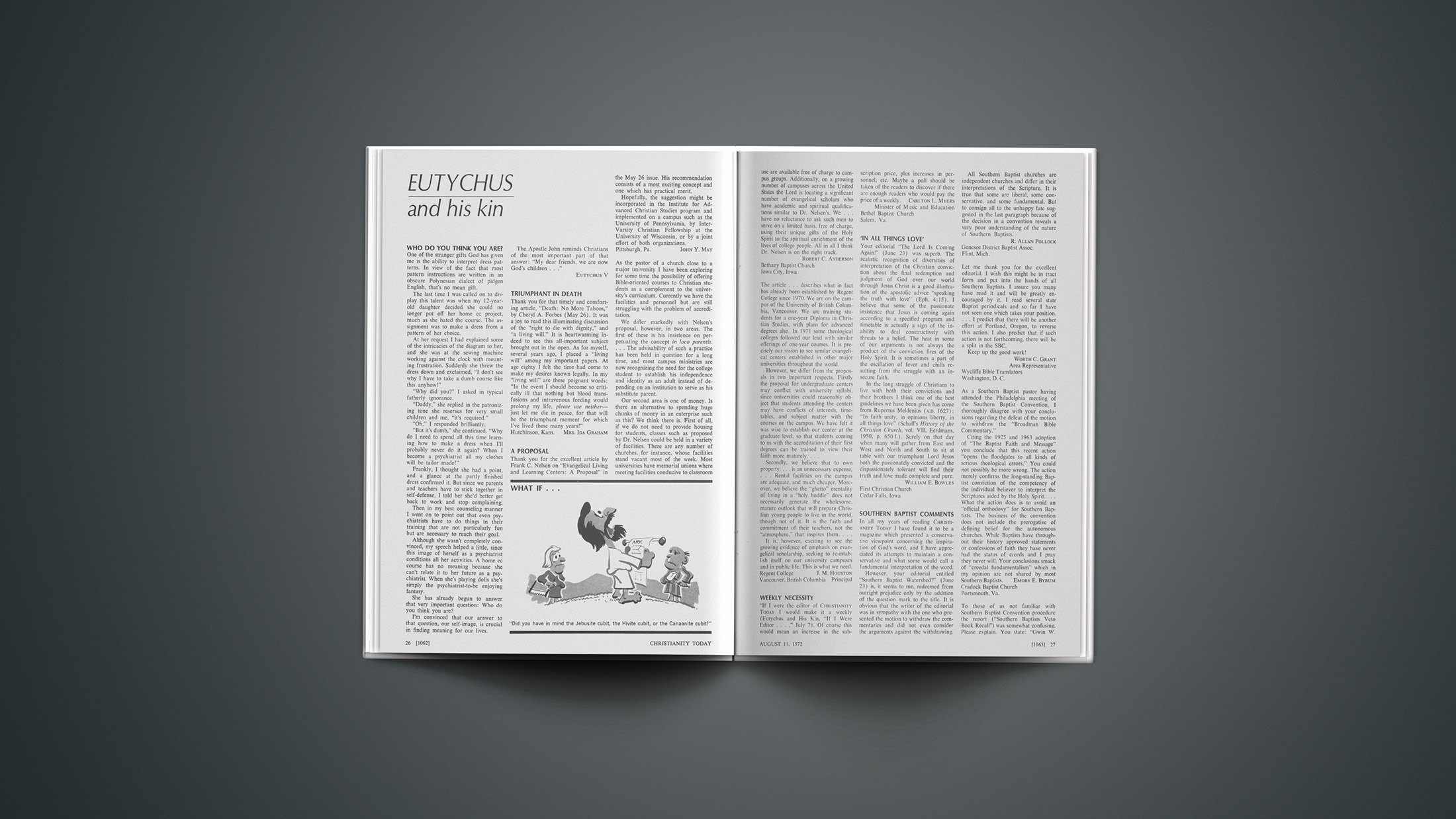 WHO DO YOU THINK YOU ARE?One of the stranger gifts God has given me is the ability to interpret dress patterns. In view of the fact that most pattern instructions are written in an obscure Polynesian dialect of pidgen English, that’s no mean gift.The last time I was called on to display this talent was when my 12-year-old daughter decided she could no longer put off her home ec project, much as she hated the course. The assignment was to make a dress from a pattern of her choice.At her request I had explained some of the intricacies of the diagram to her, and she was at the sewing machine working against the clock with mounting frustration. Suddenly she threw the dress down and exclaimed, “I don’t see why I have to take a dumb course like this anyhow!”“Why did you?” I asked in typical fatherly ignorance.“Daddy,” she replied in the patronizing tone she reserves for very small children and me, “it’s required.”“Oh.” I responded brilliantly.“But it’s dumb,” she continued. “Why do I need to spend all this time learning how to make a dress when I’ll probably never do it again? When I become a psychiatrist all my clothes will be tailor made!”Frankly, I thought she had a point, and a glance at the partly finished dress confirmed it. But since we parents and teachers have to stick together in self-defense, I told her she’d better get back to work and stop complaining.Then in my best counseling manner I went on to point out that even psychiatrists have to do things in their training that are not particularly fun but are necessary to reach their goal.Although she wasn’t completely convinced, my speech helped a little, since this image of herself as a psychiatrist conditions all her activities. A home ec course has no meaning because she can’t relate it to her future as a psychiatrist. When she’s playing dolls she’s simply the psychiatrist-to-be enjoying fantasy.She has already begun to answer that very important question: Who do you think you are?I’m convinced that our answer to that question, our self-image, is crucial in finding meaning for our lives.The Apostle John reminds Christians of the most important part of that answer: “My dear friends, we are now God’s children …”TRIUMPHANT IN DEATHThank you for that timely and comforting article, “Death: No More Taboos,” by Cheryl A. Forbes (May 26). It was a joy to read this illuminating discussion of the “right to die with dignity,” and “a living will.” It is heartwarming indeed to see this all-important subject brought out in the open. As for myself, several years ago, I placed a “living will” among my important papers. At age eighty I felt the time had come to make my desires known legally. In my “living will” are these poignant words: “In the event I should become so critically ill that nothing but blood transfusions and intravenous feeding would prolong my life, please use neither—just let me die in peace, for that will be the triumphant moment for which I’ve lived these many years!” Hutchinson, Kans.A PROPOSALThank you for the excellent article by Frank C. Nelsen on “Evangelical Living and Learning Centers: A Proposal” in the May 26 issue. His recommendation consists of a most exciting concept and one which has practical merit.Hopefully, the suggestion might be incorporated in the Institute for Advanced Christian Studies program and implemented on a campus such as the University of Pennsylvania, by Inter-Varsity Christian Fellowship at the University of Wisconsin, or by a joint effort of both organizations.Pittsburgh, Pa.As the pastor of a church close to a major university I have been exploring for some time the possibility of offering Bible-oriented courses to Christian students as a complement to the university’s curriculum. Currently we have the facilities and personnel but are still struggling with the problem of accreditation.We differ markedly with Nelsen’s proposal, however, in two areas. The first of these is his insistence on perpetuating the concept in loco parentis.… The advisability of such a practice has been held in question for a long time, and most campus ministries are now recognizing the need for the college student to establish his independence and identity as an adult instead of depending on an institution to serve as his substitute parent.Our second area is one of money. Is there an alternative to spending huge chunks of money in an enterprise such as this? We think there is. First of all, if we do not need to provide housing for students, classes such as proposed by Dr. Nelsen could be held in a variety of facilities. There are any number of churches, for instance, whose facilities stand vacant most of the week. Most universities have memorial unions where meeting facilities conducive to classroom use are available free of charge to campus groups. Additionally, on a growing number of campuses across the United States the Lord is locating a significant number of evangelical scholars who have academic and spiritual qualifications similar to Dr. Nelsen’s. We … have no reluctance to ask such men to serve on a limited basis, free of charge, using their unique gifts of the Holy Spirit to the spiritual enrichment of the lives of college people. All in all I think Dr. Nelsen is on the right track.Bethany Baptist ChurchIowa City. IowaThe article … describes what in fact has already been established by Regent College since 1970. We are on the campus of the University of British Columbia, Vancouver. We are training students for a one-year Diploma in Christian Studies, with plans for advanced degrees also. In 1971 some theological colleges followed our lead with similar offerings of one-year courses. It is precisely our vision to see similar evangelical centers established in other major universities throughout the world.However, we differ from the proposals in two important respects. Firstly the proposal for undergraduate centers may