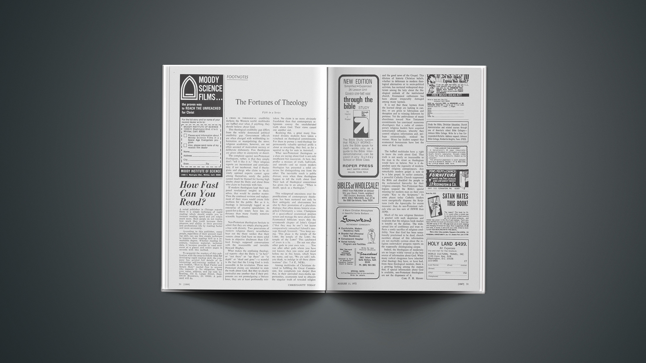 Fifth in a SeriesA crisis in theological credibility darkens the Western world; multitudes are baffled over what, if anything, they should believe about God.This theological credibility gap differs from the widely denounced political credibility gap. Government officials are often charged with withholding information or manipulating the news; religious academics, however, are not often accused of malevolent secrecy or deliberate dishonesty. Few theologians are given either to anonymity or deceit.The complaint against neo-Protestant theologians, rather, is that they simply don’t “tell it like it is.” Their religious reports are inconsistent and contradictory, if not incoherent. And if theologians and clergy who claim to be divinely updated experts cannot agree among themselves, surely the public cannot much be blamed for having high doubts about the Deity and about those who claim to fraternize with him.If modern theologians kept their supposed revelational insights to themselves, that would be another matter. Then the continual revision and replacement of their views would create little problem for the public. But as it is, theology is increasingly tagged as an enterprise of creative speculation; its queen-for-a-day tenets have less endurance than many frankly tentative scientific hypotheses.Neo-Protestant theologians hesitate to admit that they are simply playing peek-a-boo with divinity. Two generations of modern religious theory nevertheless bear out the blunt verdict that their rumors about God have no more solid basis in objective disclosure than Clifford Irving’s supposed conversations with the inaccessible and invisible Howard Hughes.What makes the confusing theological reports—that the Deity is “in here” or “out there” or “up there” or “in depth” or “dead and gone”—a scandal is the fact that the Living God is truly accessible in his revelation. These neo-Protestant claims are intended to state the truth about God. But they so clearly contradict one another that if their proponents are not promulgating a literary hoax, they are at least profoundly mistaken. No claim is no more obviously fraudulent than that contemporary religionists convey the unadulterated truth about God. Their views cancel one another out.Realizing this, a great many frustrated divinity students have taken a raincheck on theological commitments. For them to pursue a mod-theology for permanently valuable spiritual profit is about as rewarding, they feel, as for a squirrel to dig for nuts in Astroturf.What neo-Protestant theologians as a class are saying about God is not only insufficient but inaccurate. At best, they proffer a mixture of truth, half-truth, and untruth—and no recent modern theologian has presented a solid criterion for distinguishing one from the other. The inevitable result is public distrust, even when these theologians happen to tell the truth about God. Their lack of theological concurrence has given rise to an adage: “When in doubt, speak as a theologian.”This widespread uneasiness over the pontifications of contemporary theologians has been nurtured not only by their ambiguity and abstruseness but also by their promotion of a pluralistic dialogue that often denies historic evangelical Christianity a voice. Champions of a quasi-official ecumenical position screen and manage the news about God. Ecumenical biblicism wears thin the seventeenth chapter of John’s Gospel (“that they may be one”) but leaves comparatively untouched Jahweh’s message through Jeremiah: “You keep saying, This place is the temple of the LORD, the temple of the LORD, the temple of the LORD!’ This catchword of yours is a lie.… Do not run after other gods to your own ruin.… You run after other gods whom you have not known; then you come and stand before me in this house, which hears my name, and say, ‘We are safe’; safe, you think, to indulge in all these abominations” (Jer. 7:4 ff., NEB).Among multitudes of Christians devoted to fulfilling the Great Commission, few complaints run deeper than that, in their unrivaled mass-media opportunities, ecumenists tend to obscure the singular truth of revealed religion and the good news of the Gospel. This dilution of historic Christian beliefs, whether in deference to modern theological alternatives or to socio-political activism, has nurtured widespread skepticism among the laity about the theological outlook of the institutional church. Ecumenical enthusiasm has been almost irreparably damaged among many laymen.It is not that these laymen think the learned clergy are lacking in candor, or are given to fabrication and deception and to winning followers by pretense. Yet the ambivalence of many churchmen toward New Testament commitments has convinced numerous churchgoers that a cadre of contemporary religious leaders have acquired unwarranted influence, whereby they control religious information and, perhaps unintentionally, mislead the masses. Many lay leaders suspect that ecumenical bureaucrats have lost the sense of final truth.The baffled multitudes have a right to know the truth about God. That truth is not nearly so inaccessible to the man in the street as theologians would have us believe. Nor is it dependent upon the ingenuity of modern-minded religious entrepreneurs. Any remarkably modern gospel is sure to be a false gospel. In earlier centuries, a powerful Catholic Church suppressed the Bible and shackled the people to the ecclesiastical hierarchy for their religious concepts. Neo-Protestant theologians suspend the Bible’s special meaning for modern man on their own cryptic “Key to the Scriptures.” In some places today Catholic leaders more energetically dispense the Scriptures (with the Apocrypha for excess measure) than do neo-Protestant radicals who are less sure of JHWH than JEPD.Much of the new religious literature is greeted with such skepticism and suspicion that the religious book market is notably on 