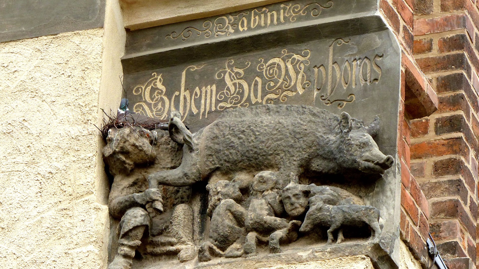 Perched 26 feet above the ground, on the exterior southeast corner of the Town Church, is a 14th-century sandstone sculpture of a pig with two people in identifiably medieval Jewish hats suckling at its teats and another holding a piglet’s ear. An additional Jewish person lifts the tail while looking into the sow’s rear. Written above the relief is an inscription with the words, “Rabini Shem Hamphoras.” This nonsensical reference to the Jewish appellation of God’s name, added after Luther’s time, quotes a derogatory comment in one of Luther’s writings.