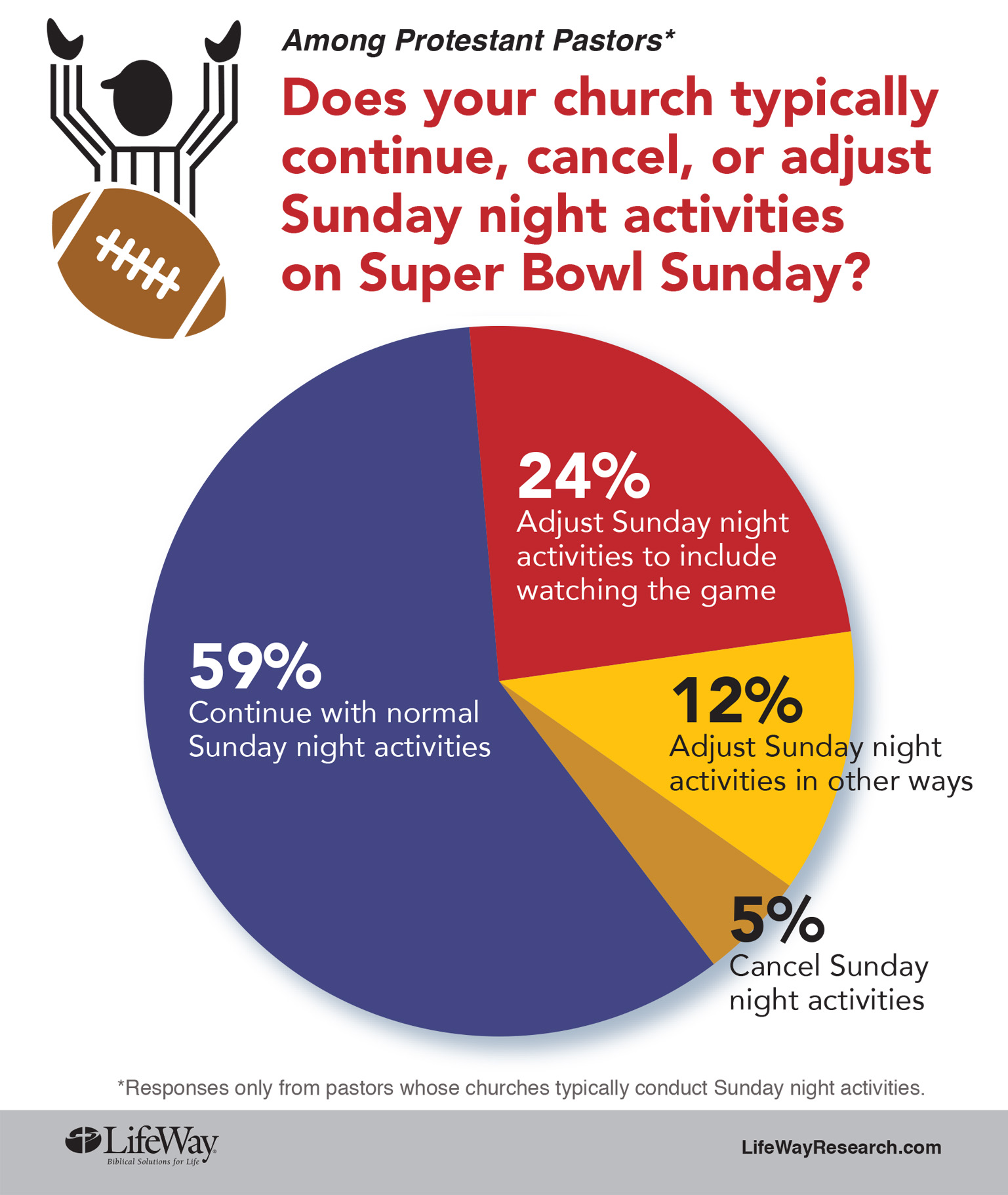 According to a new study from LifeWay Research, 68 percent of Protestant pastors say their church typically has some activity on Sunday night. And among those pastors, almost 6 in 10 say they will continue as normal on the night of the Super Bowl (59%).