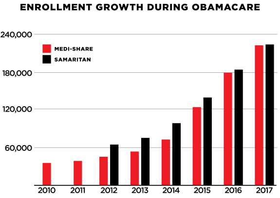 Since the adoption of Obamacare, Medi-Share has added 5,000, 10,000, and even 50,000 members year-over-year, growing sixfold since 2010.