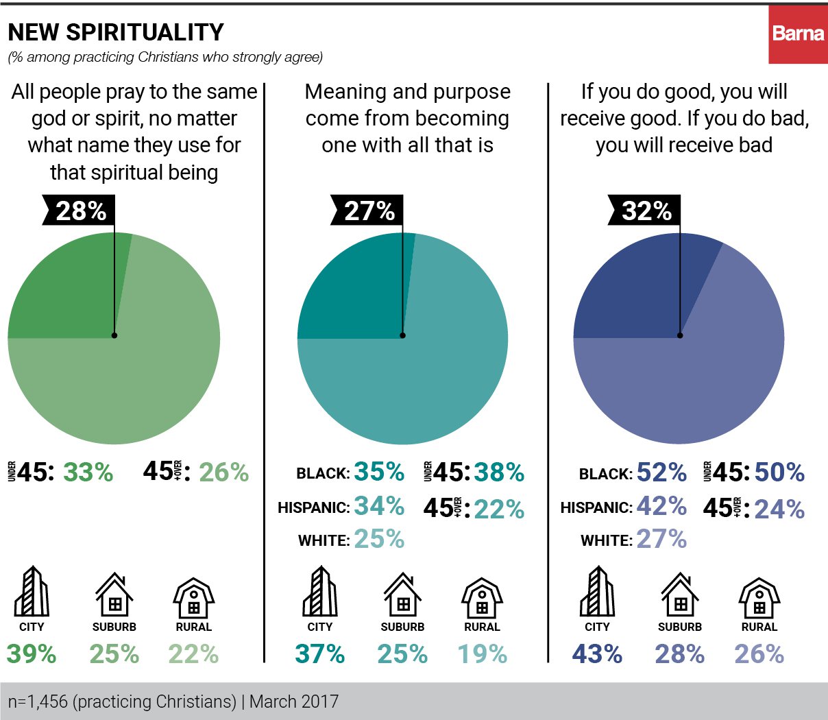 Nearly 1 in 3 practicing Christians strongly agree that “if you do good, you will receive good, and if you do bad, you will receive bad.” Barna suggested that these beliefs appealed “to many Christians’ sense of ultimate justice.”