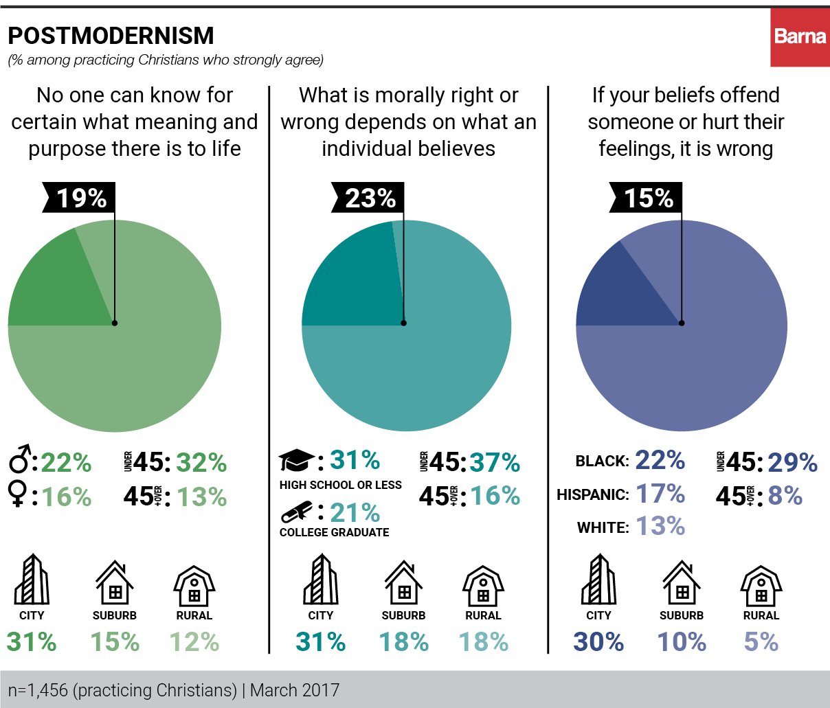 While most practicing Christians reject postmodernism’s claims about subjective truth, 1 in 5 practicing Christians strongly agree that “no one can know for certain what meaning and purpose there is to life.” A similar number (23%) of practicing Christians strongly agree that “what is morally right or wrong depends on what an individual believes.”
