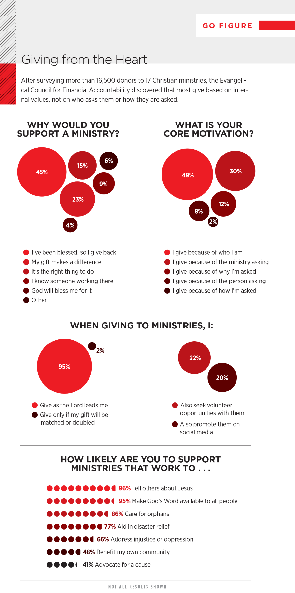 Up-and-coming donors are bringing with them a new set of priorities. Nearly a quarter of millennial Christian givers (22%) say efficiency and effectiveness are good reasons to support an organization, compared to 12 percent of those over 35, according to a groundbreaking study by the Evangelical Council for Financial Accountability (ECFA). It asked about the motivations of more than 16,000 donors to Christian ministries.